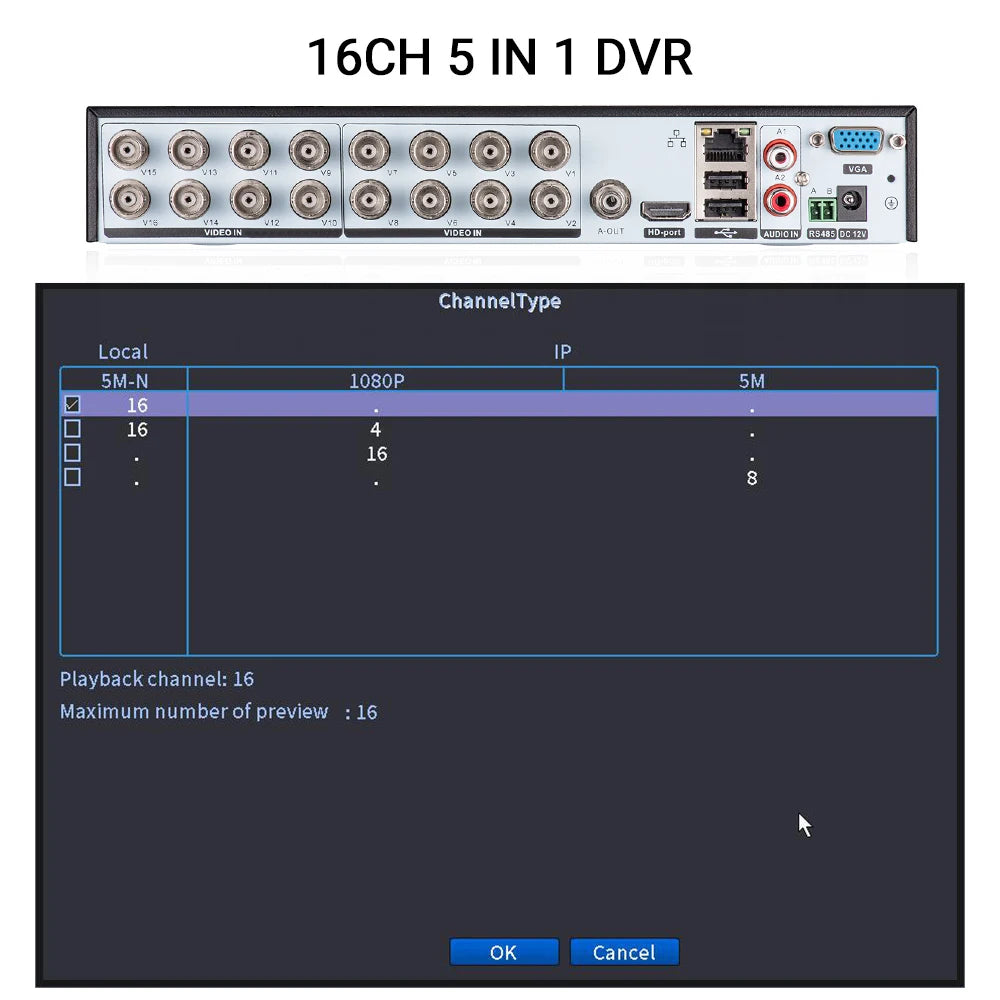 16 Channels CCTV DVR 5MP-N 5in1 AHD TVI CVI CVBS IP Camera Hybrid Digital Video Recorder Secuirty System Remote Access H.265