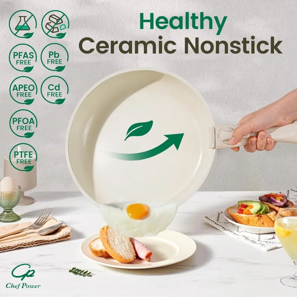 Ceramic Cookware Set Non Toxic with Detachable Handles, Healthy Nonstick Pans and Pots Set 19 Pcs,PFOA & PTFE Free,Cream White