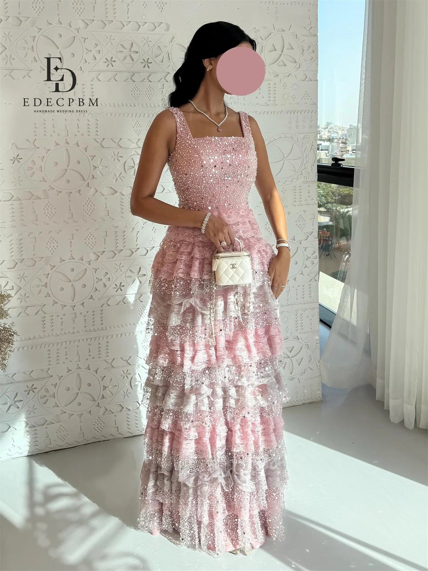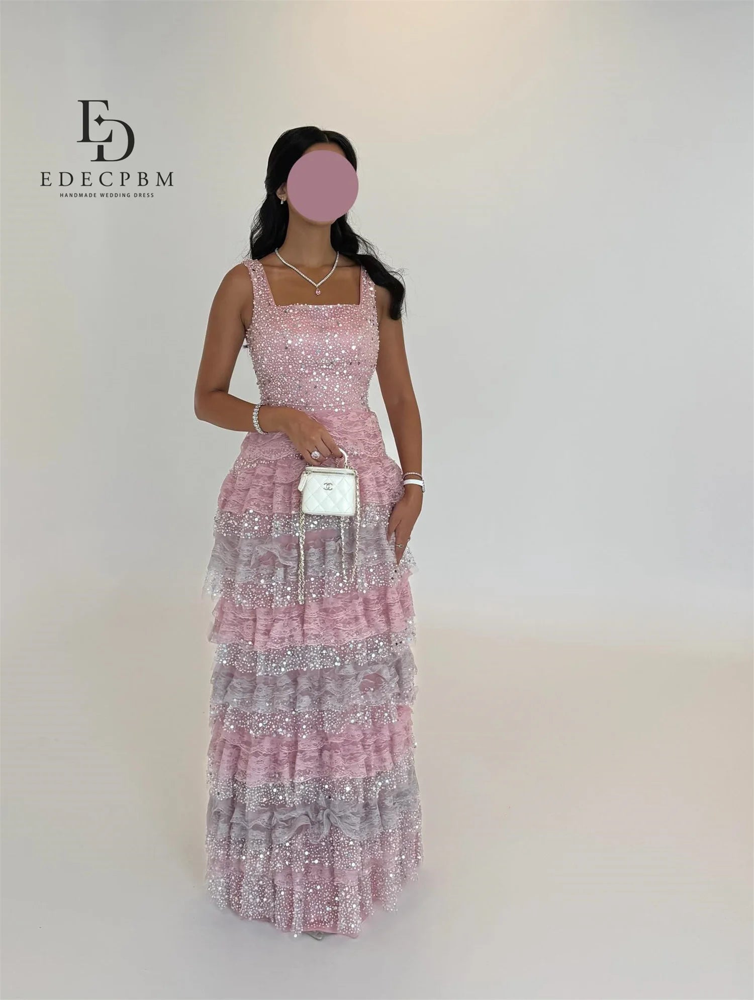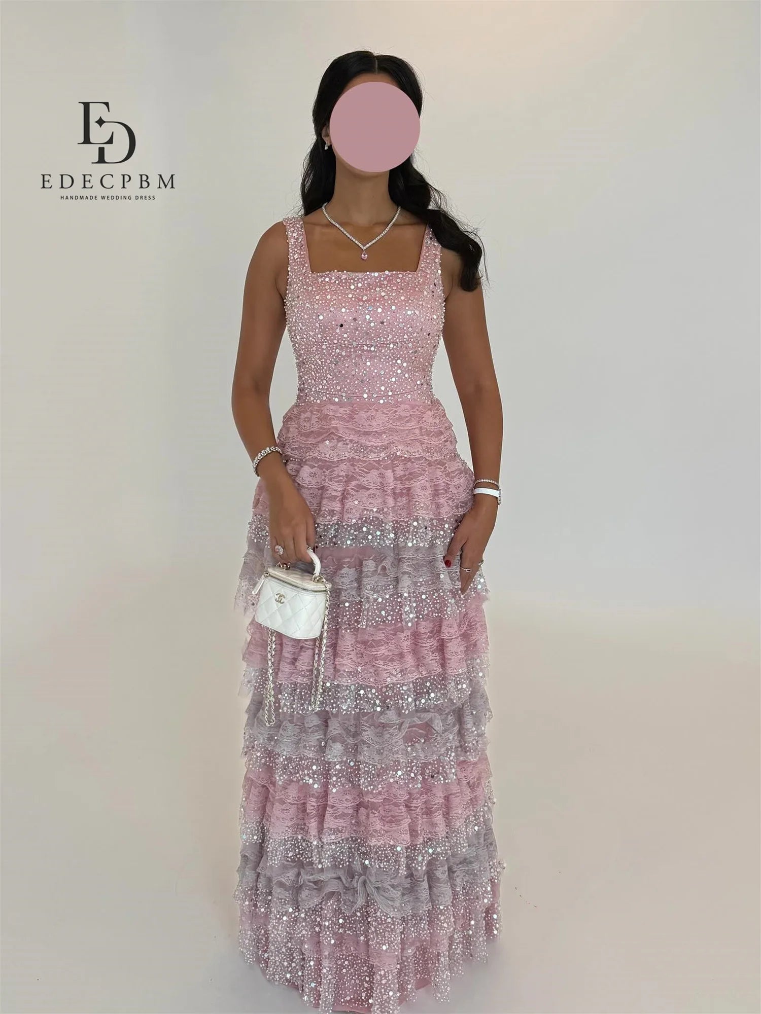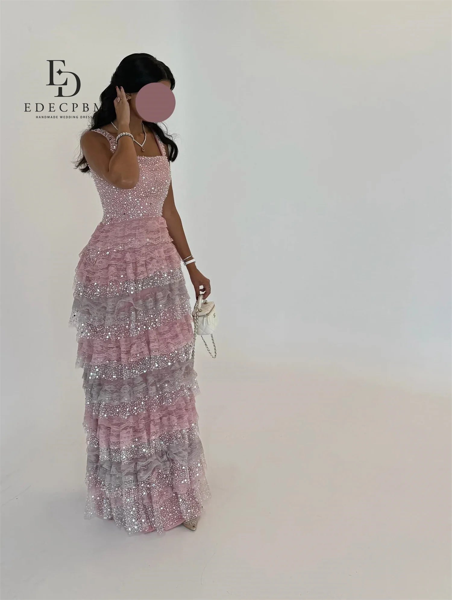 EDECPBM Pink Women Evening Dress Luxurious Evening Dresses 2025 Luxury Vestidos De Festa Sequins Multi-layer فساتين سهرة Prom