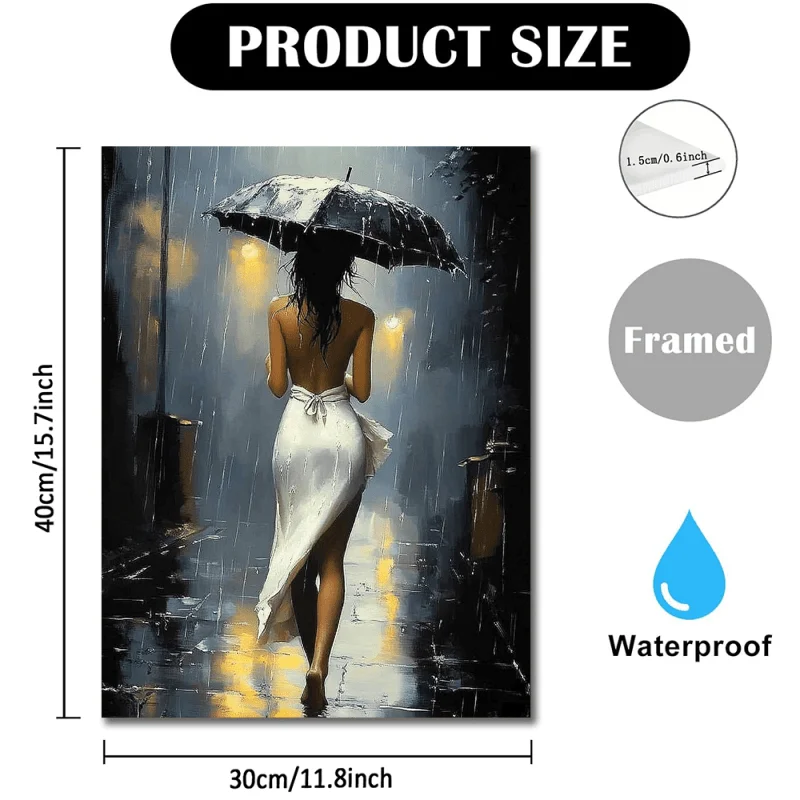 [Elegant Style] Romantic Rainy Night Canvas Art with Wooden Frame–Elegant Umbrella Street Scene, Perfect for Living Room,Bedroom