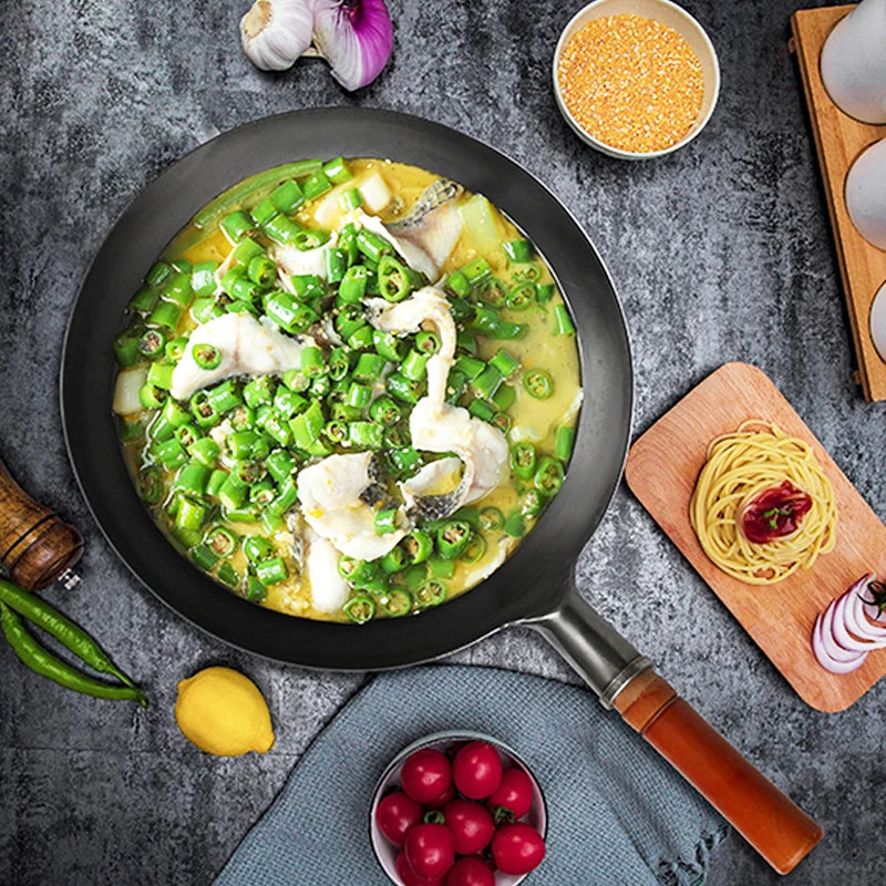 Konco Hand Hammered Wok,Chinese Traditional Iron Wok No Coating Wooden Handle Non-stick Pan Kitchen Cookware