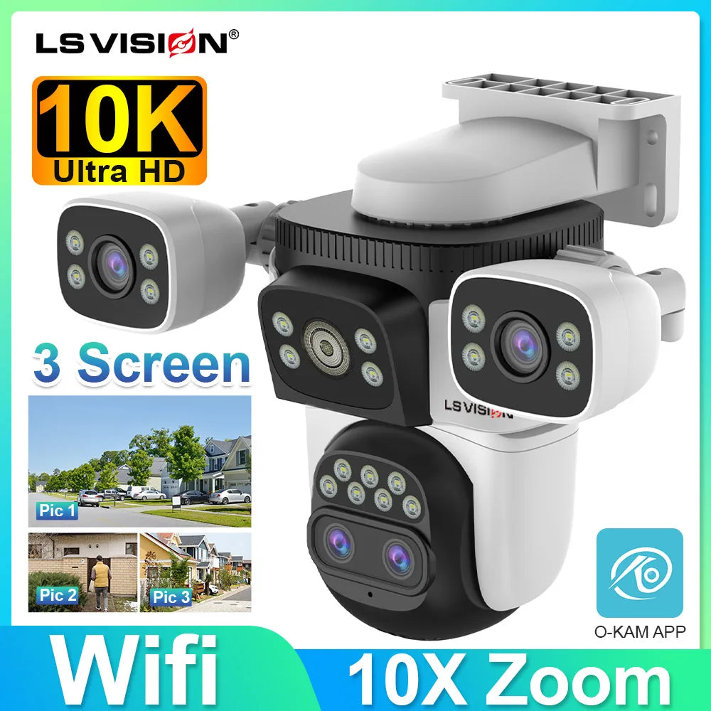 LS VISION 20mp 3 Screens Outdoor Surveillance Camera Wifi Camera 10X Zoom 10k PTZ Auto Tracking Two-way Audio Cctv Cam