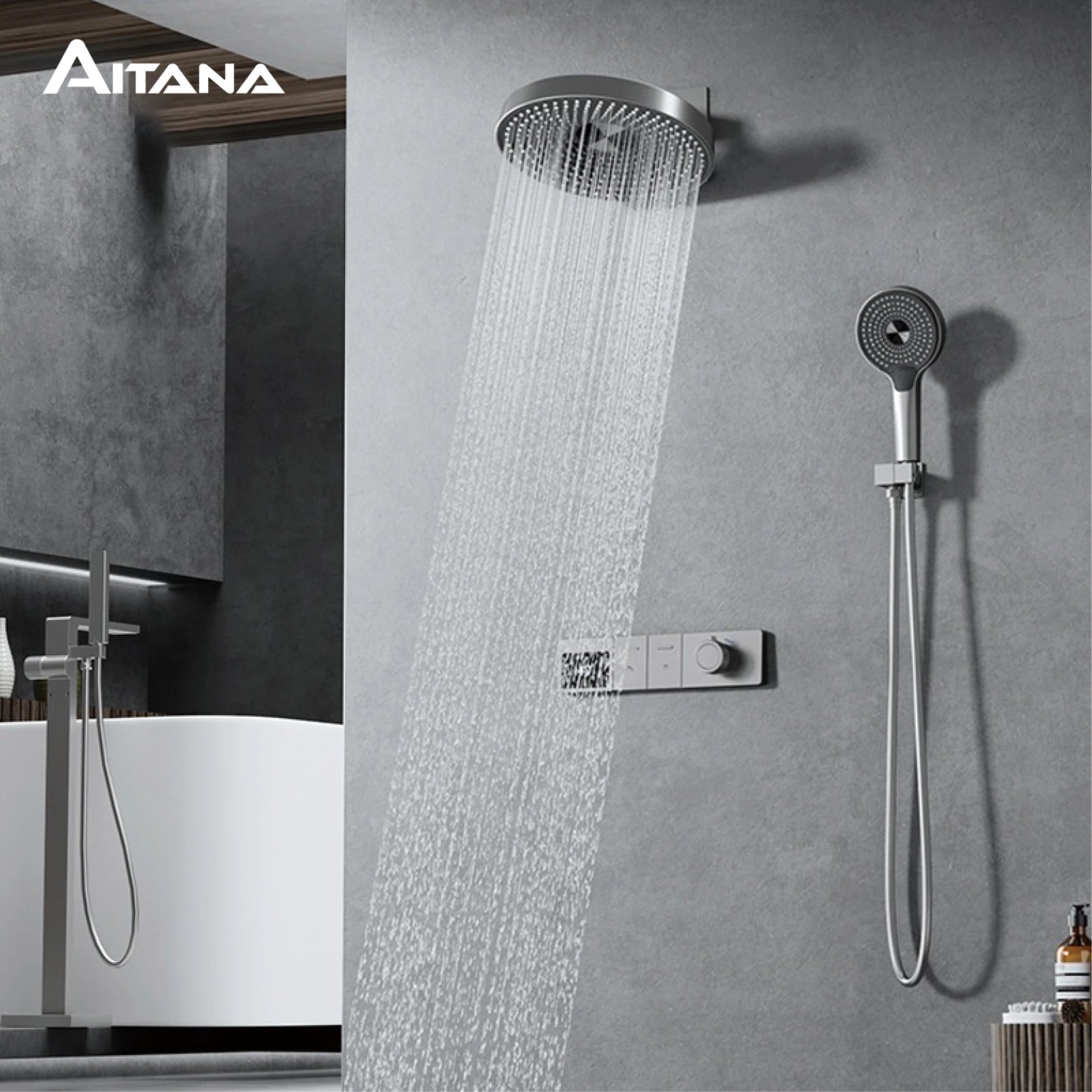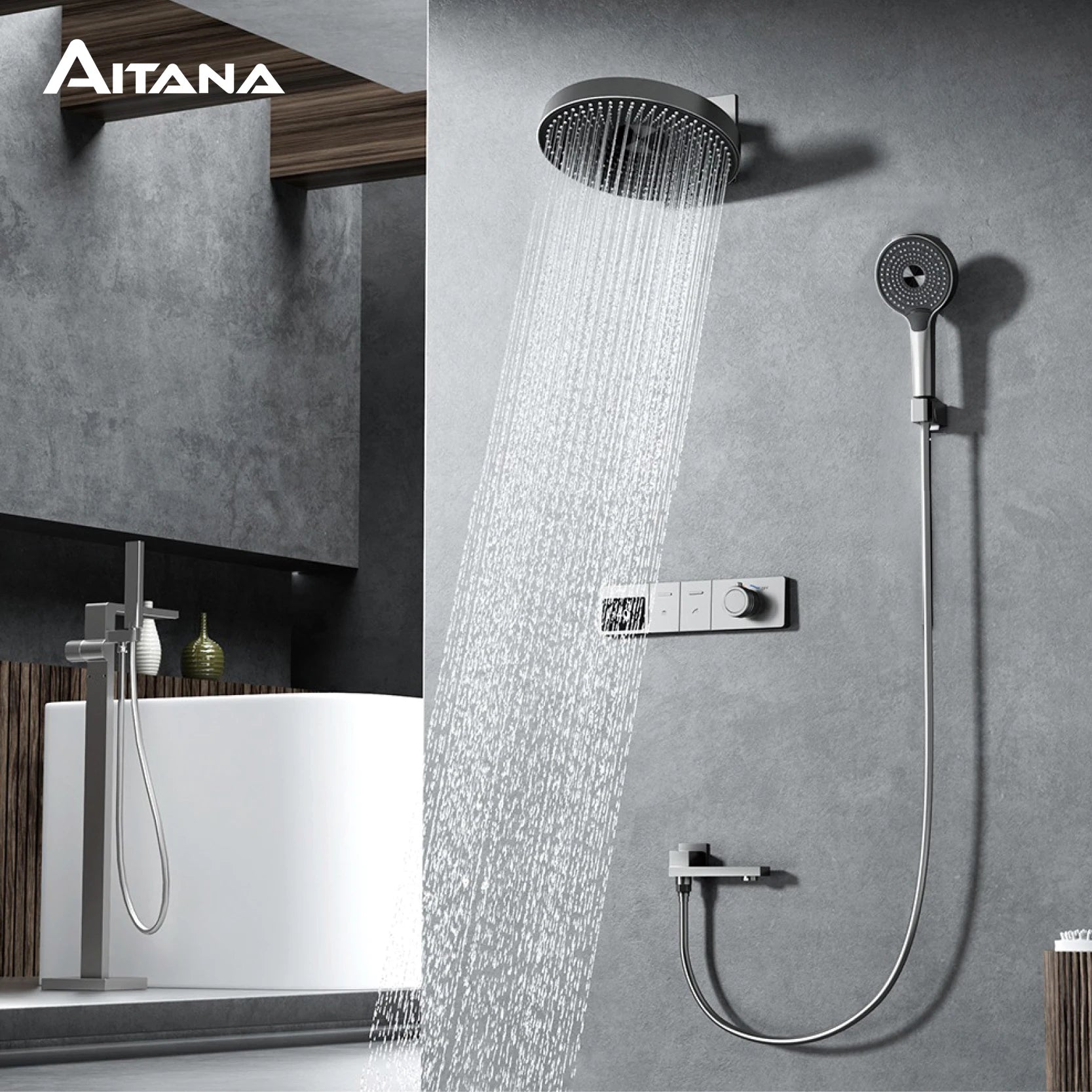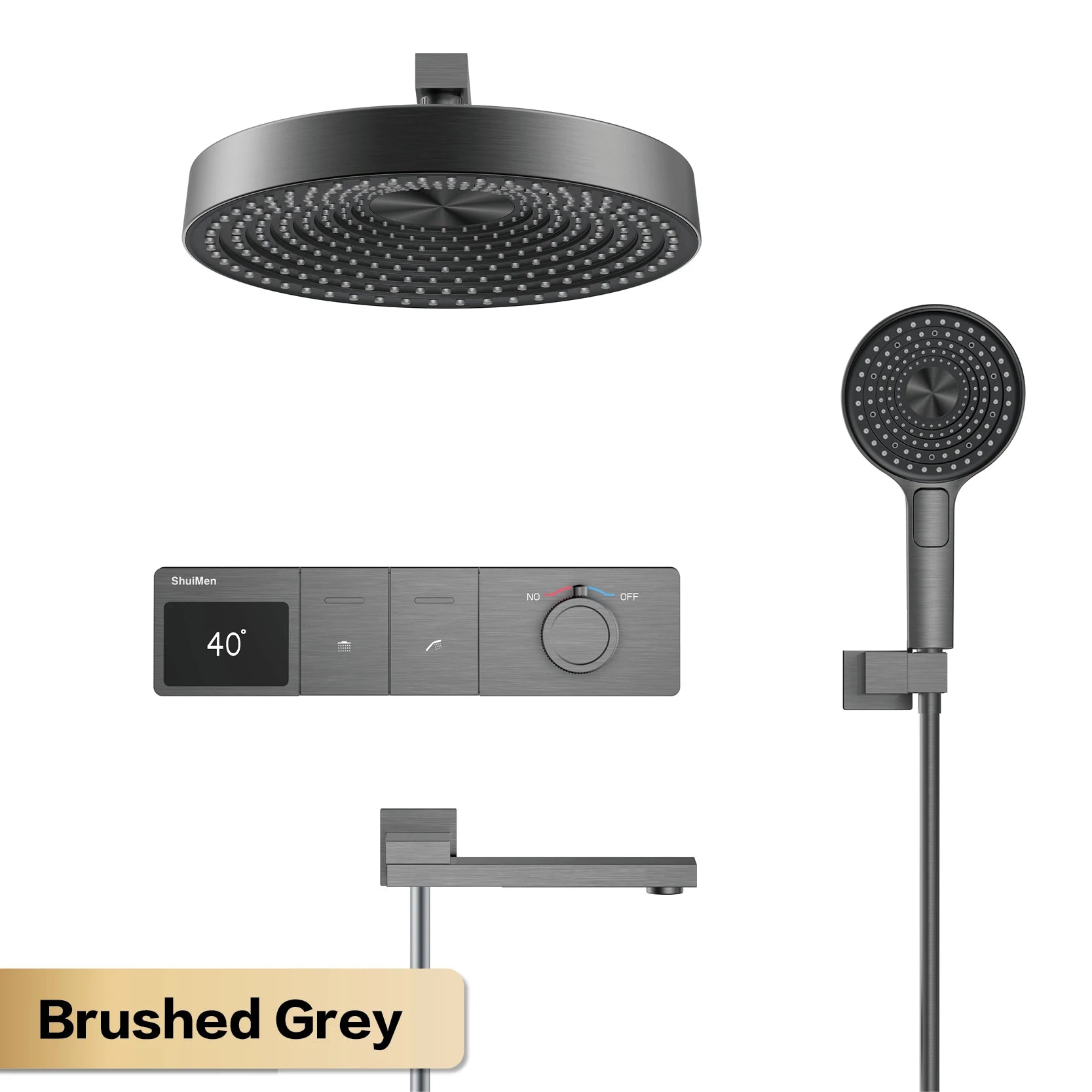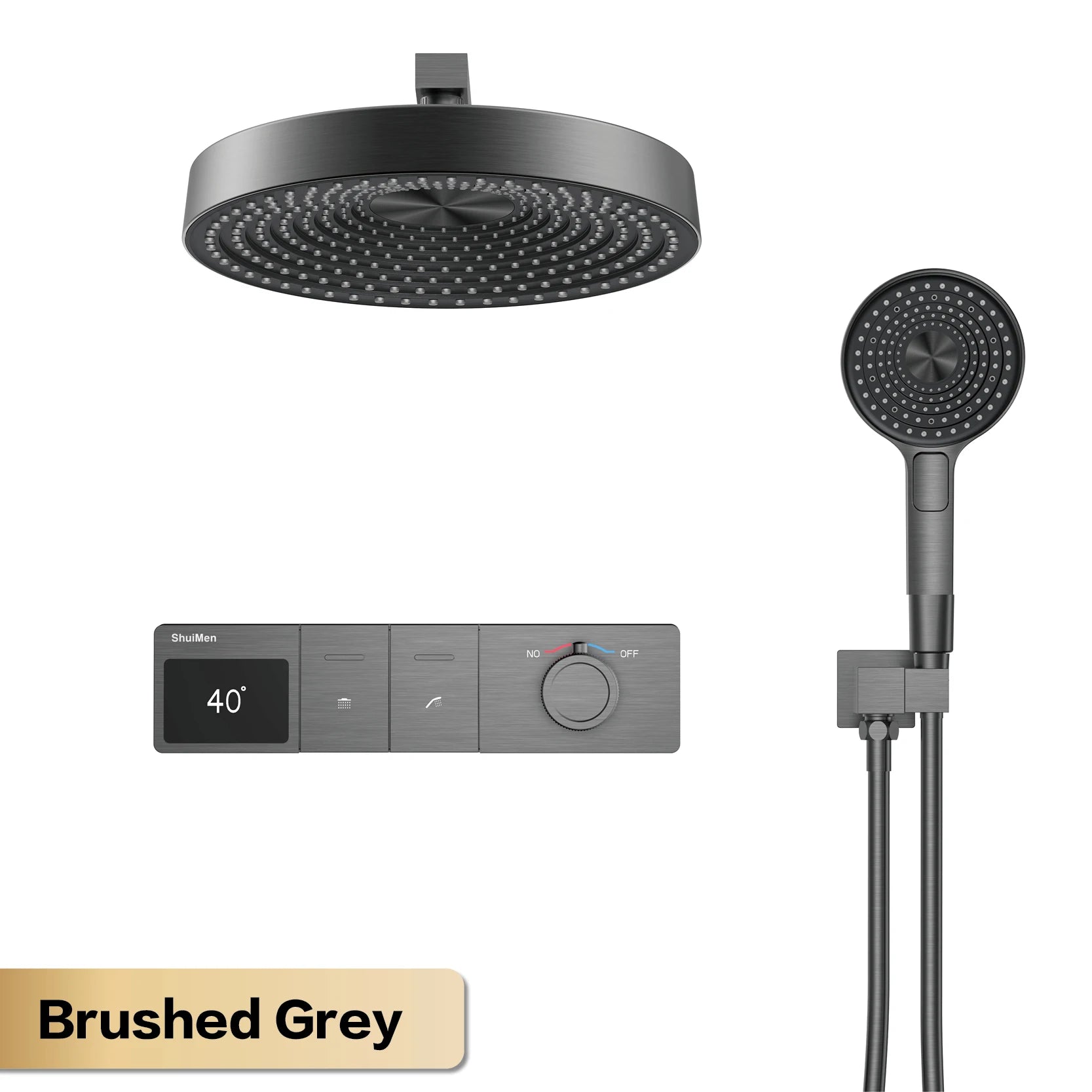 Luxury gun gray brass LED digital display shower system with wall mounted design, simple bathroom faucet for hot and cold water