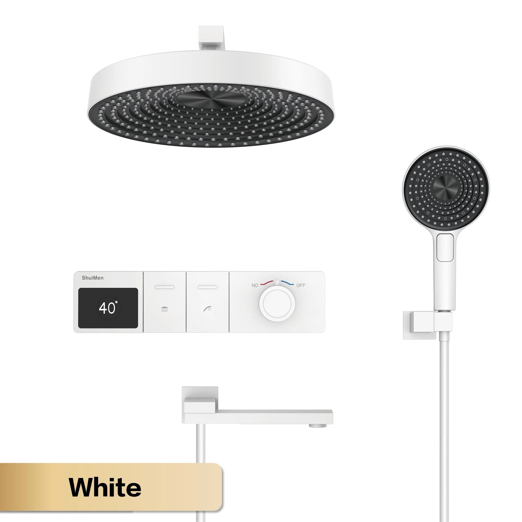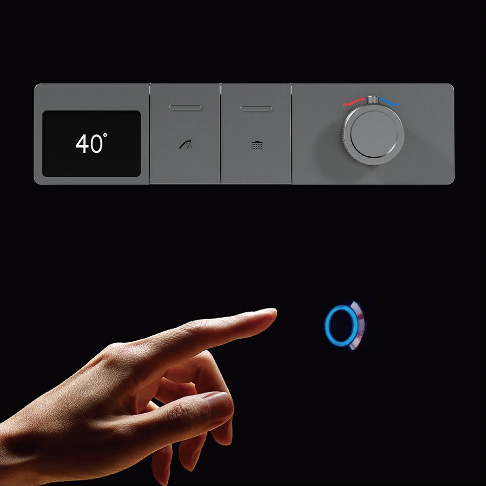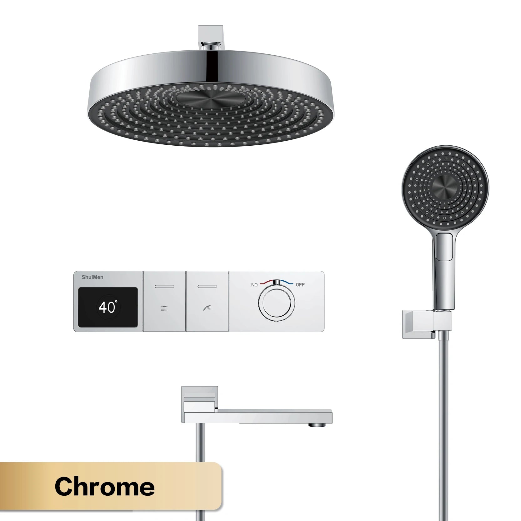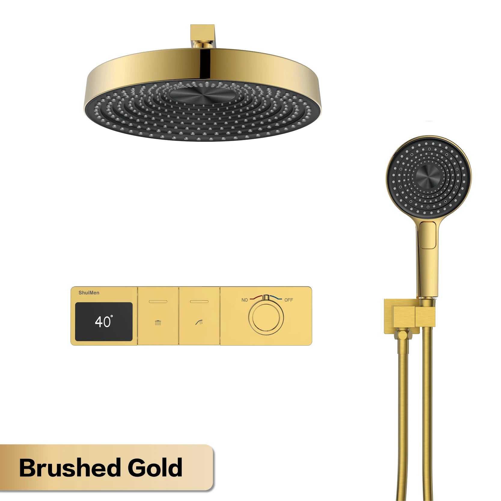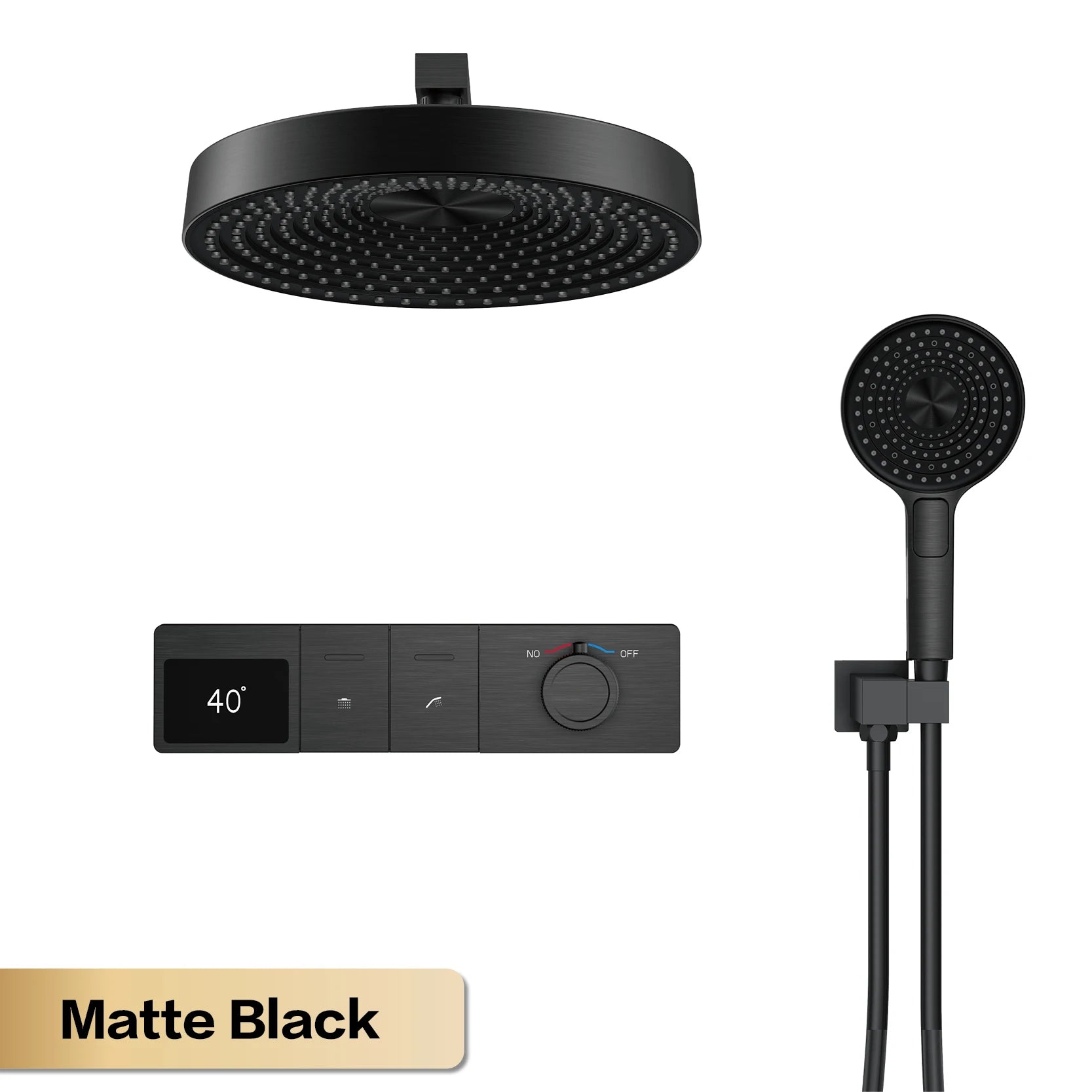 Luxury gun gray brass LED digital display shower system with wall mounted design, simple bathroom faucet for hot and cold water