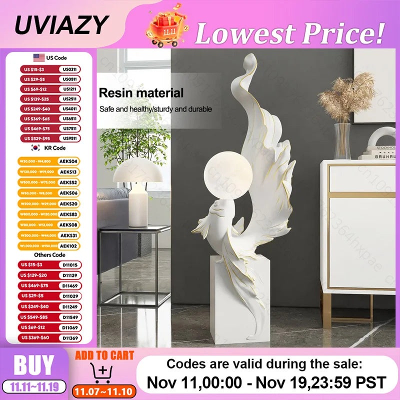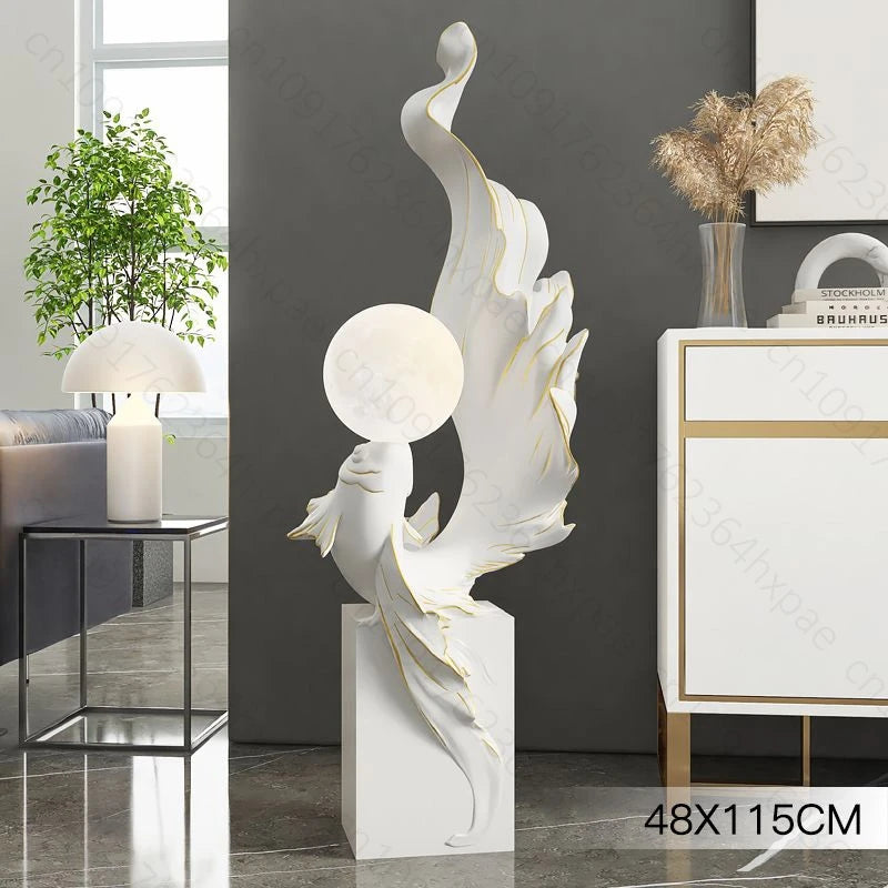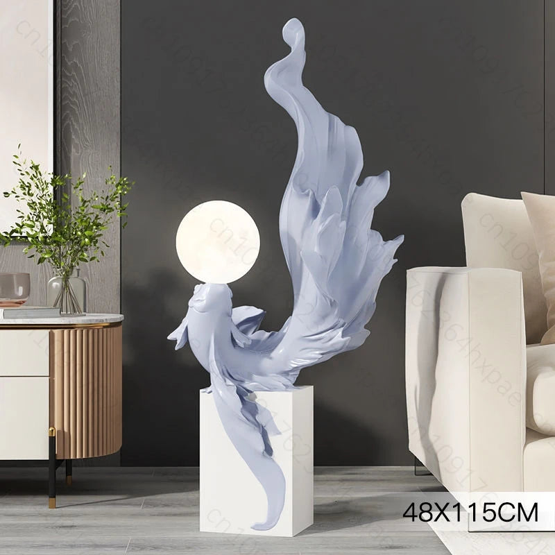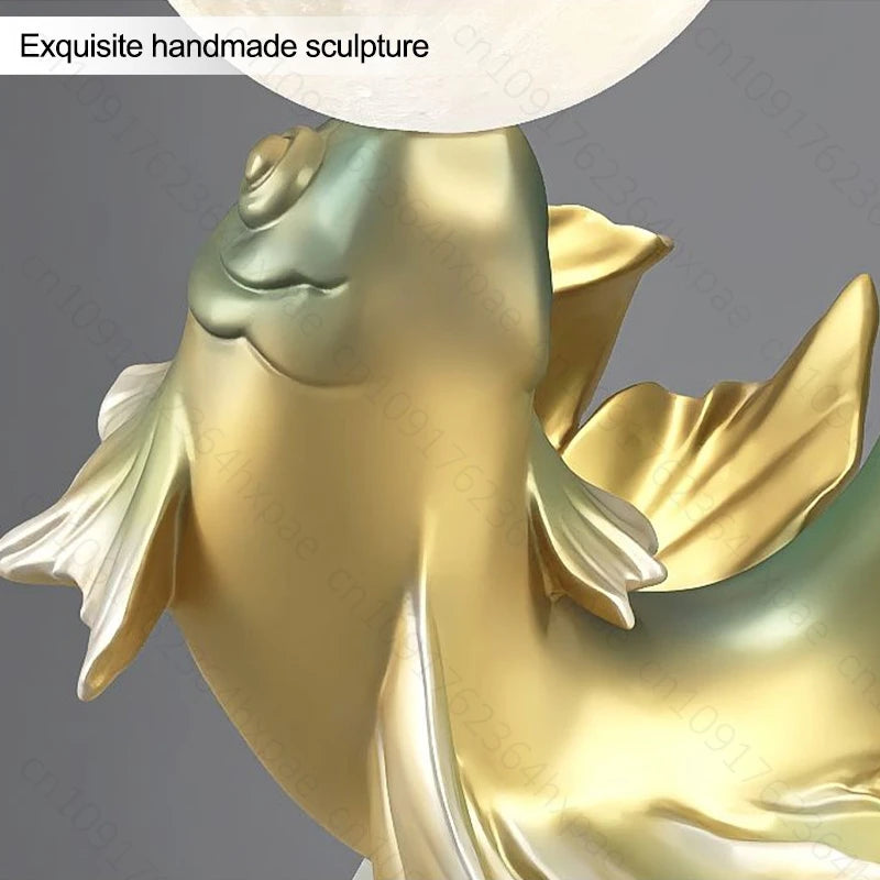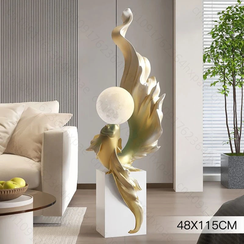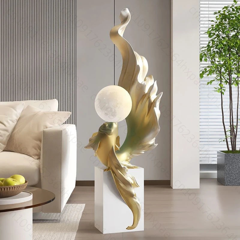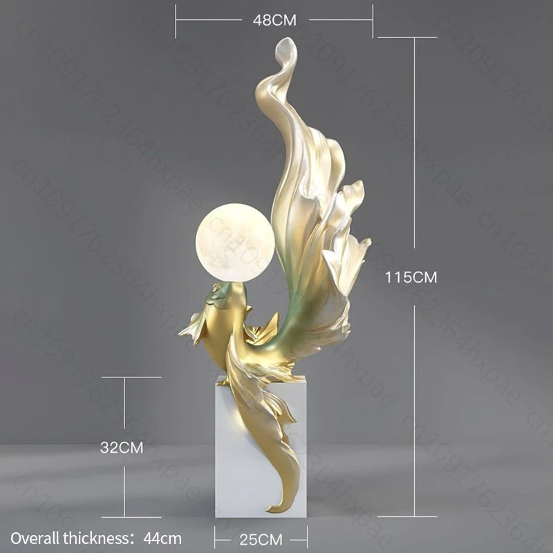 Luxury LED Moon Light Koi Fish Floor Sculpture Elegant Interior Home Decor Handcrafted Sculptural Art for Living Room Entryway
