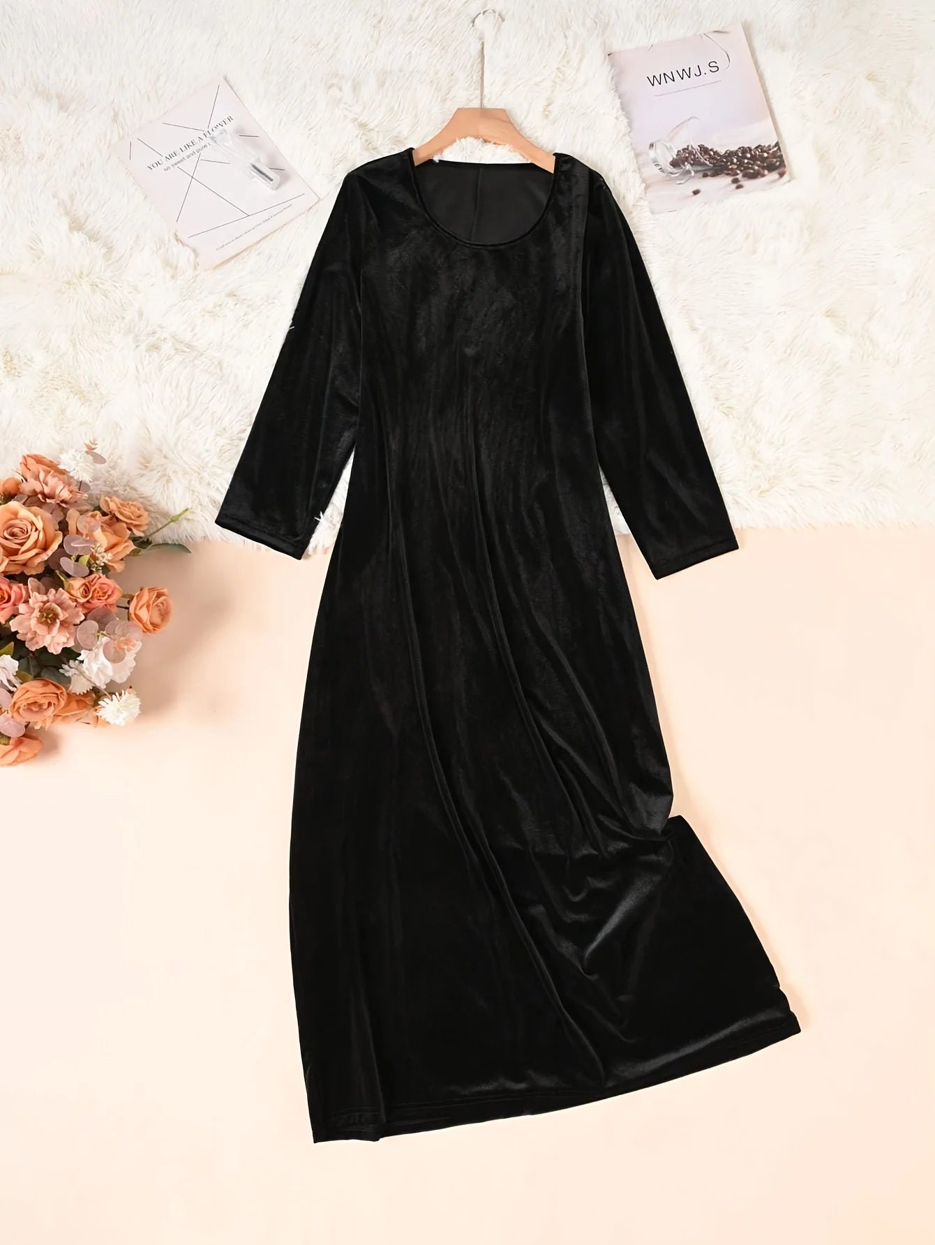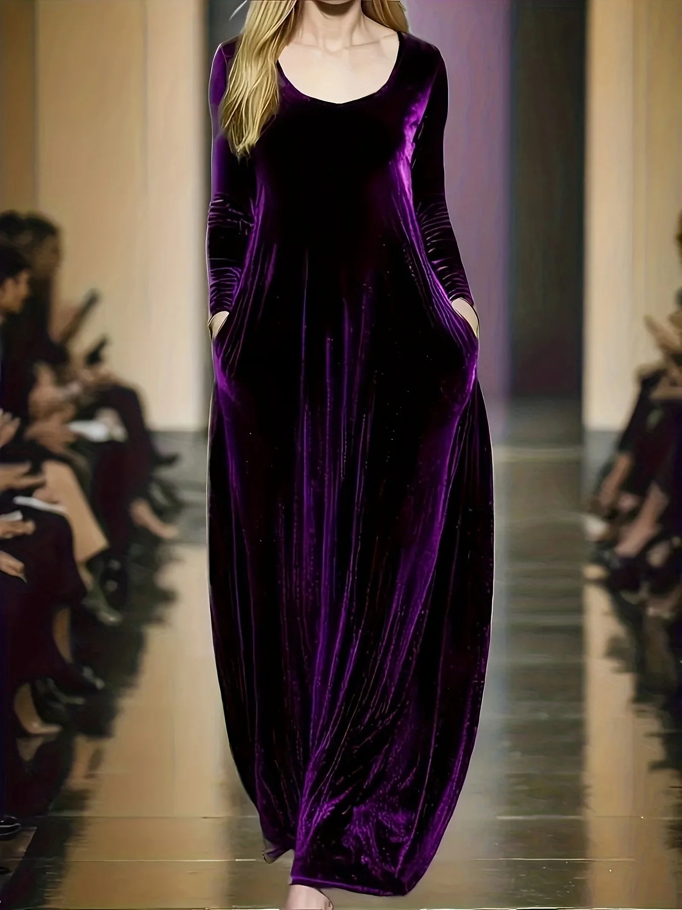 Plus-size European and American cross-border autumn and winter solid color casual elegant pocket velvet long dress