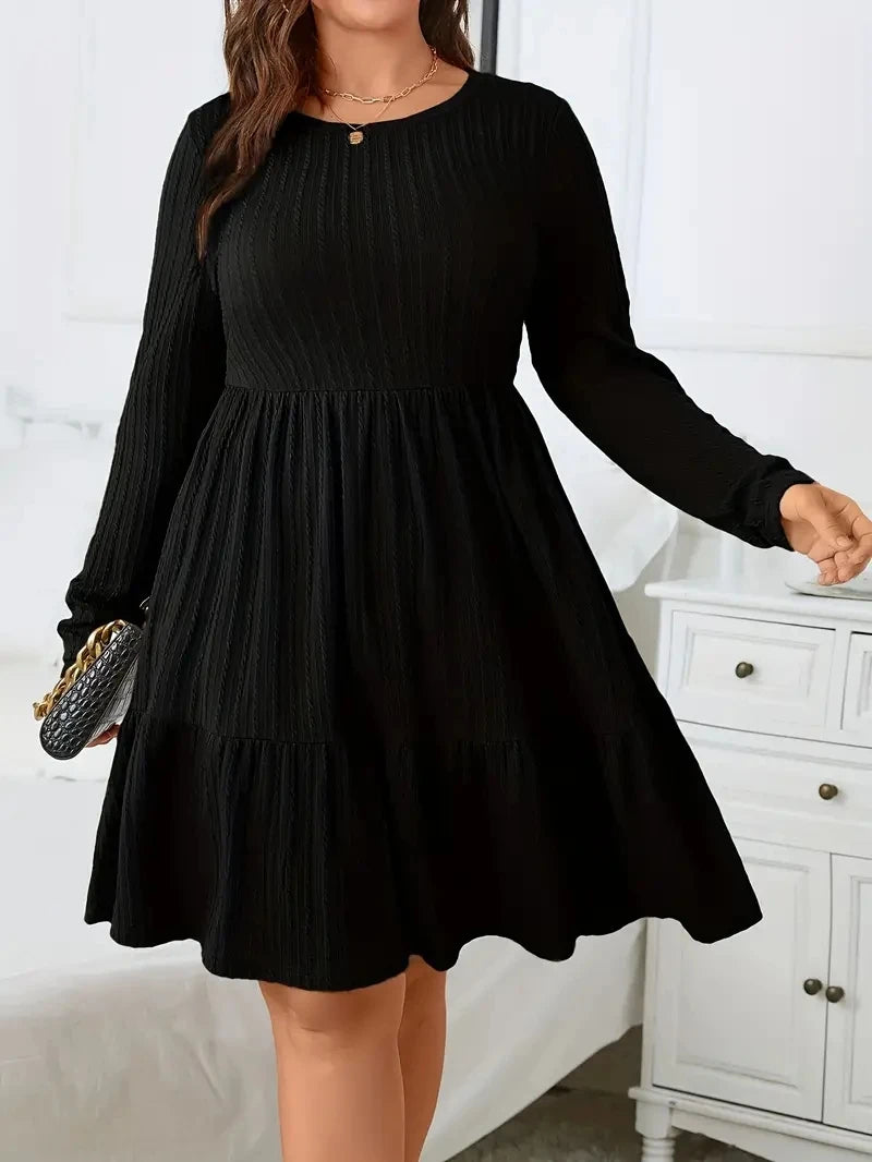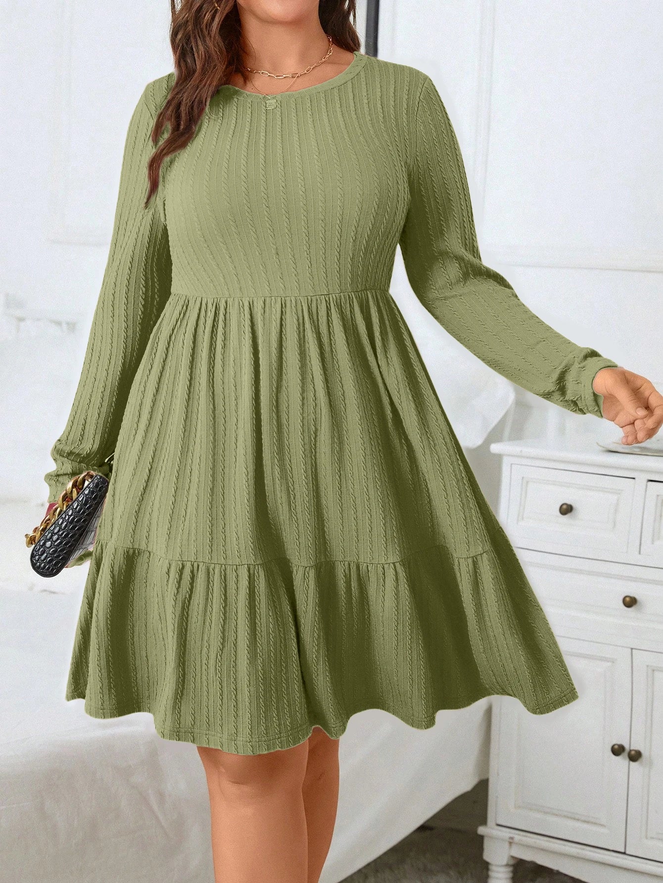 Plus size women's autumn and winter dress, solid color round neck long sleeve ruffle hem dress with pockets, autumn and winter p
