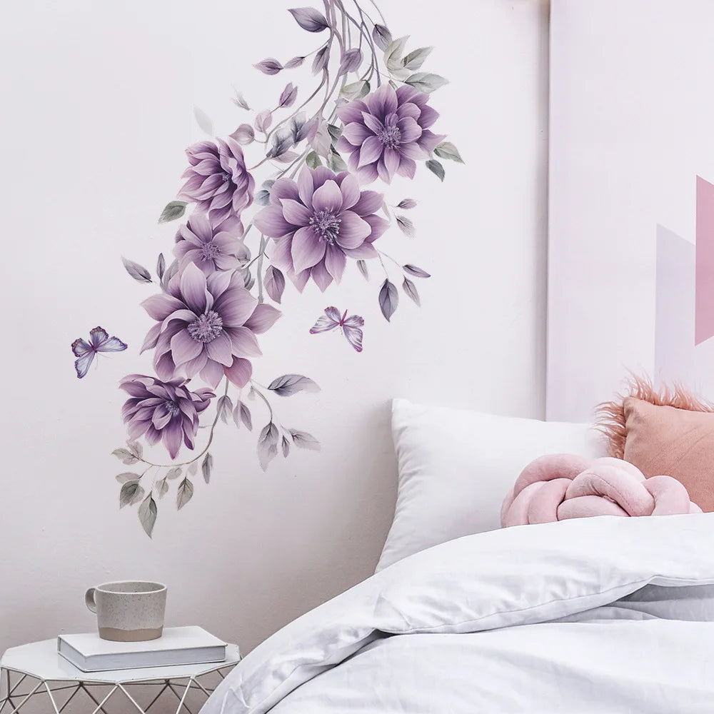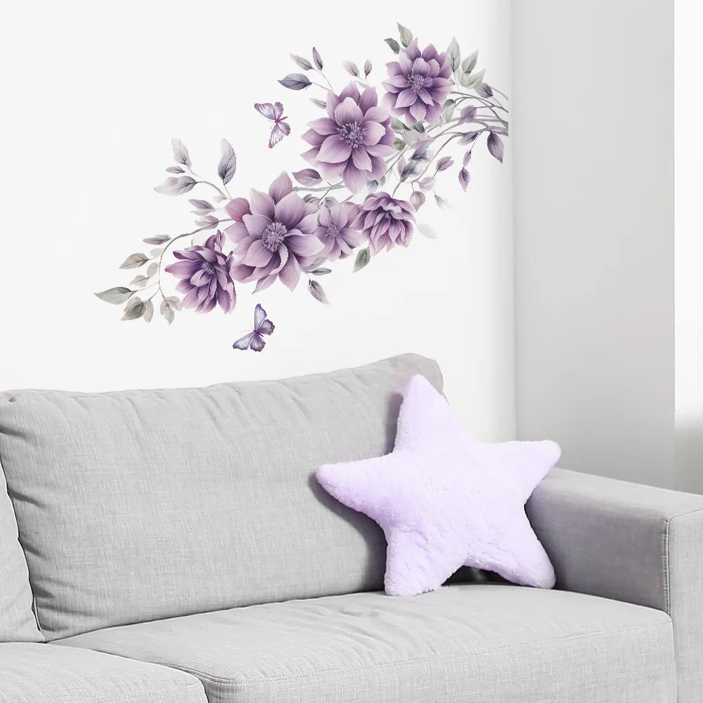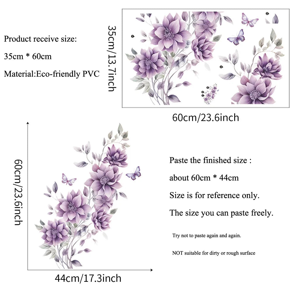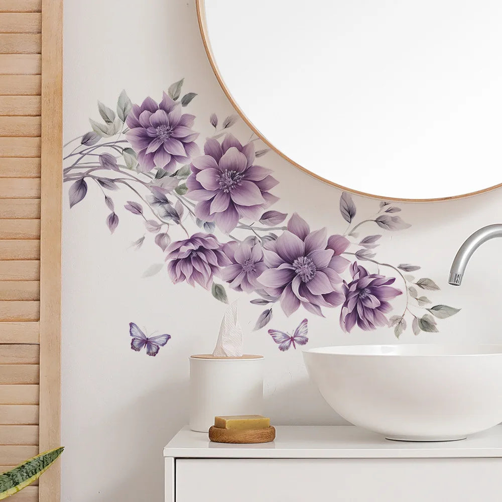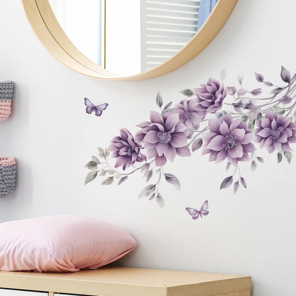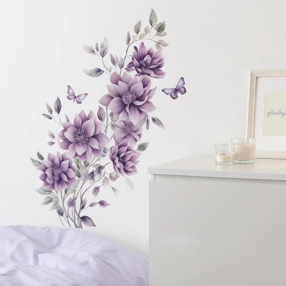 Purple Flowers Butterfly Wall Stickers Living Room Bedroom Background Decor Mural Bathroom Home Decoration Self-adhesive Decals