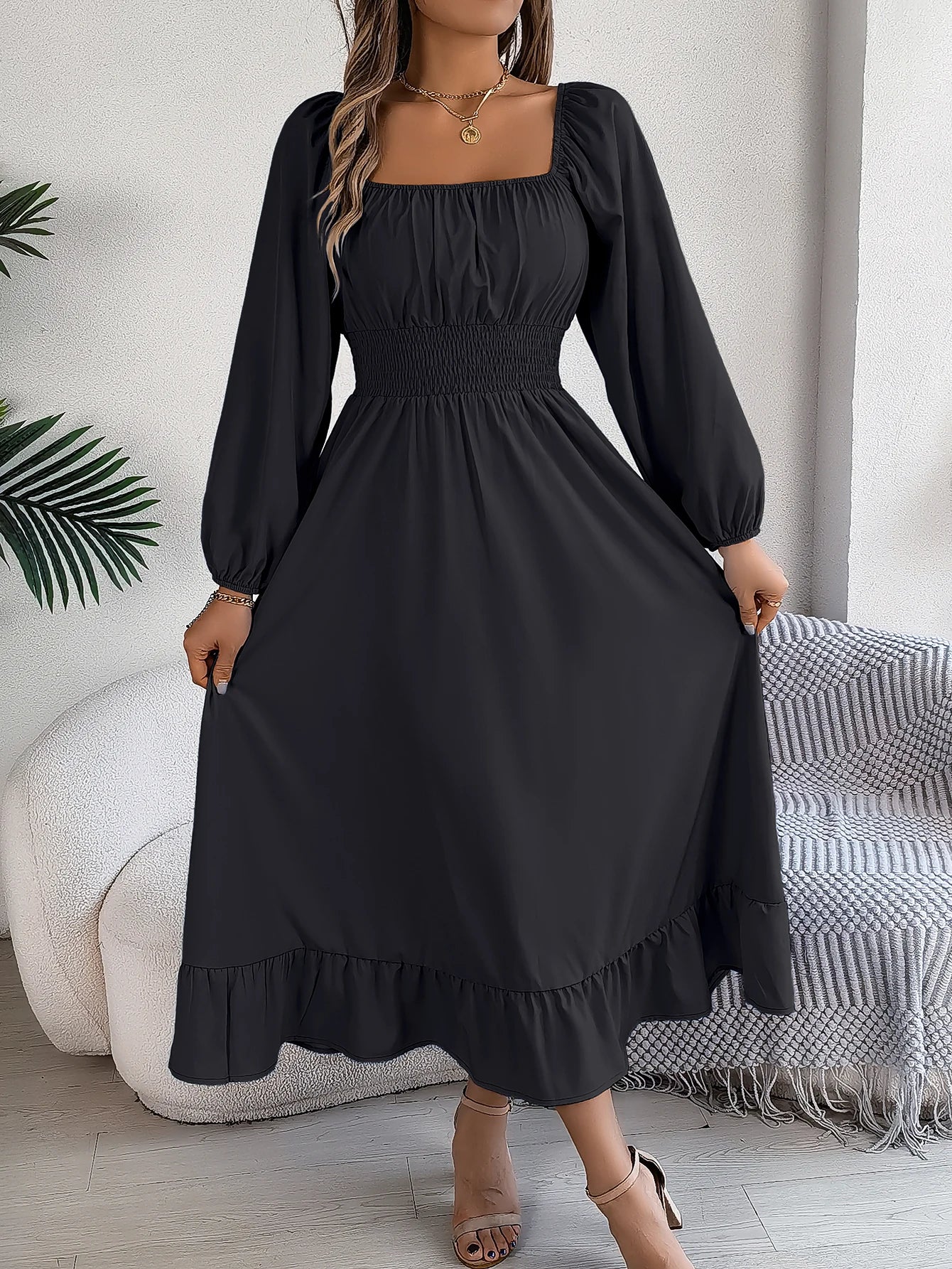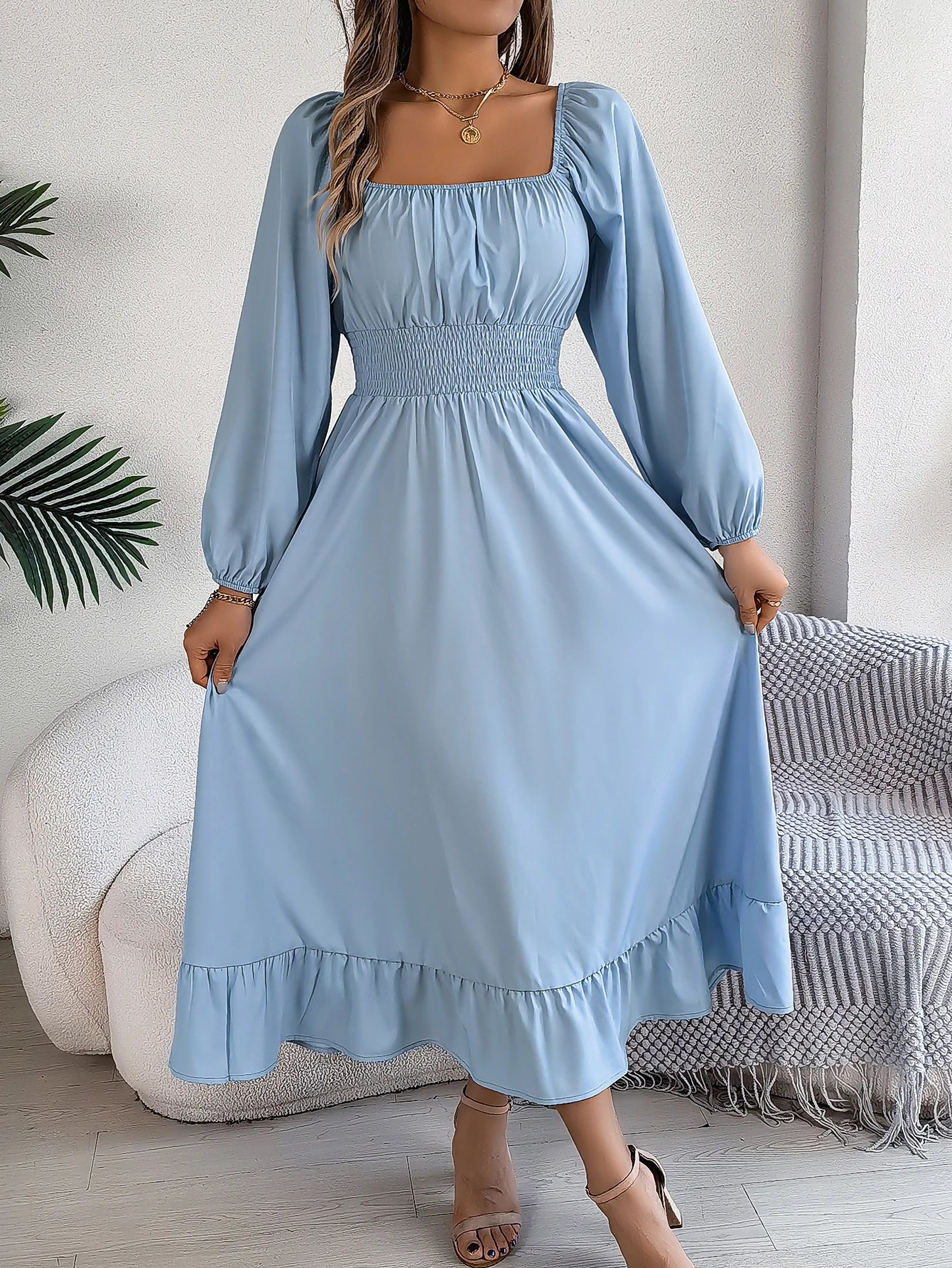 Spring Summer Elegant High Waist Square Neck Long Sleeve Ruffled Edge Long Dresses for Bridesmaids Red Blue Khaki Women Dresses