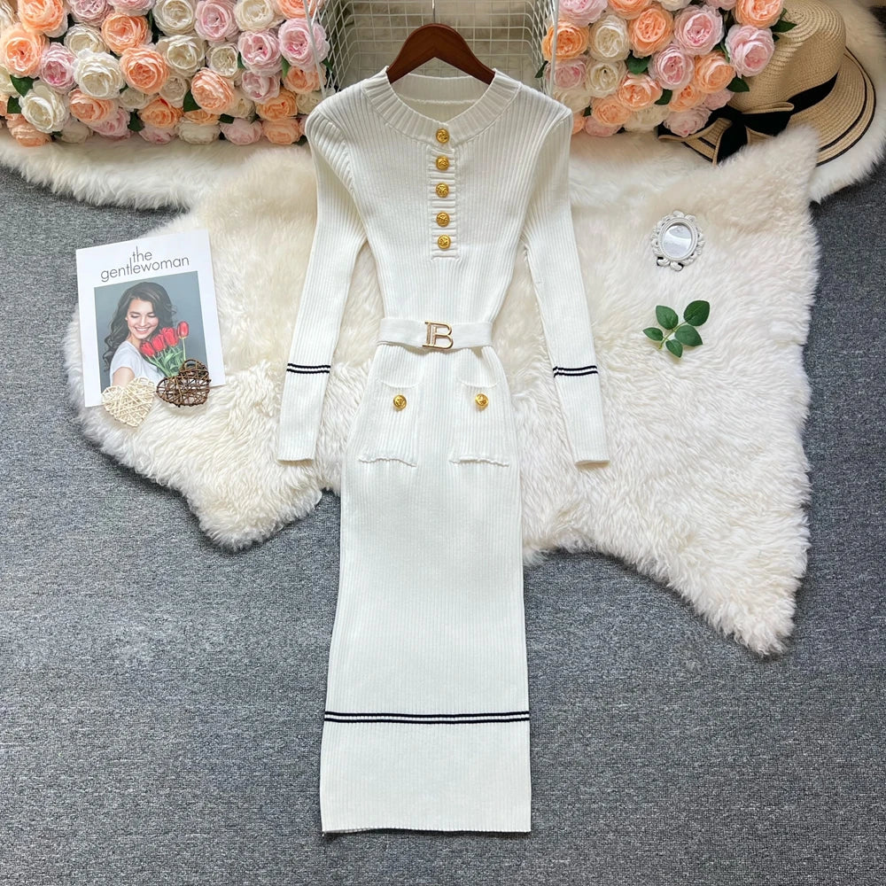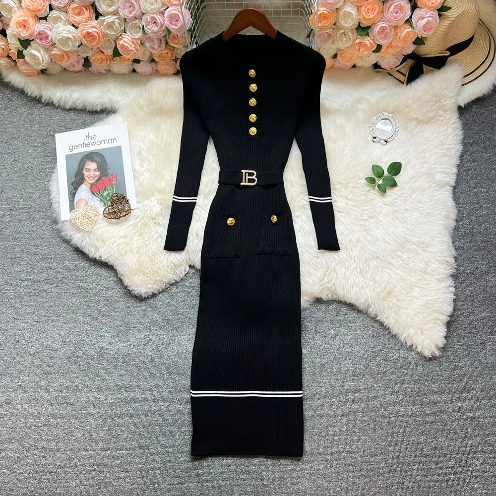 YuooMuoo 2025 Autumn Winter Women Knitted Long Dress Elegant O-neck Buttons Slim Waist Belted Sweater Dress Office Lady Vestidos