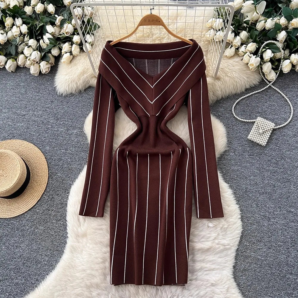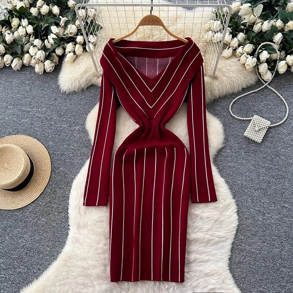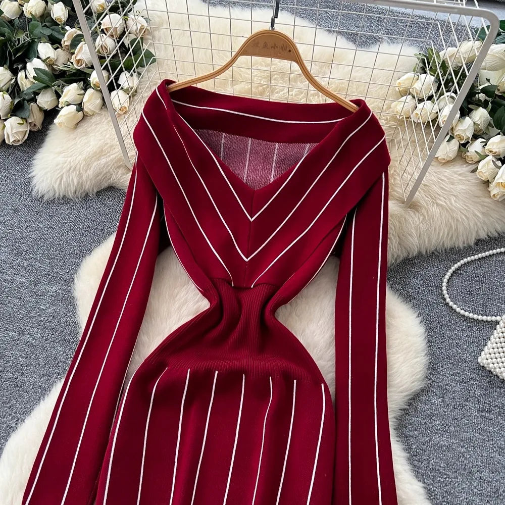 YuooMuoo Chic Fashion Elegant Wrap Hip Knitted Autumn Dress Women Vintage Slim Waist Stripes Bodycon Sweater Dress Lady Vestidos