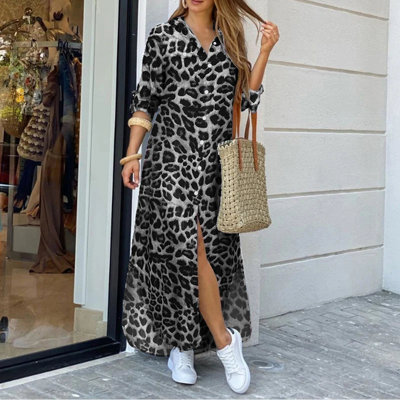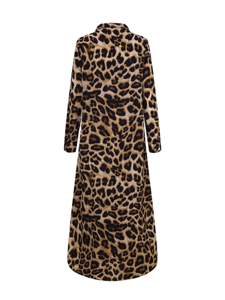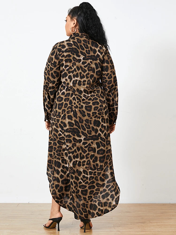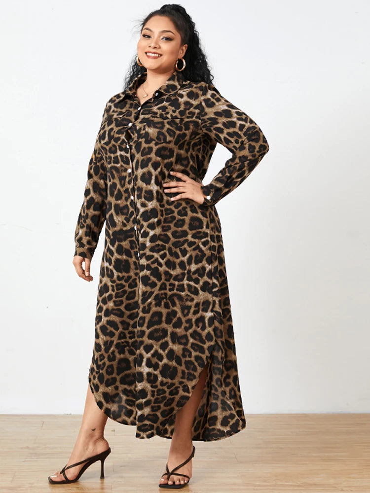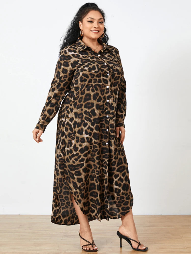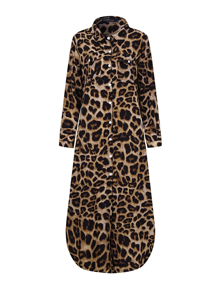 ZANZEA Plus Size Women's Leopard Print Long Dresses Stylish Long Sleeve Button Up Collared Shirt Dress 2025 Autumn Commuting 5XL